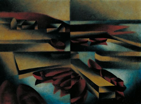 Sandor Bortnyik made this yellow-green landscape sometime in the 20th century with oil on canvas. It’s so cool to see how he's building up this geometric world with a limited color palette – those oranges, greens, and blacks play off each other so well. There’s something about the texture here that grabs me; the paint looks like it's been layered on with a bit of thickness, and it gives the whole thing a tactile feel, even from a distance. You can almost feel the brushstrokes, especially in those darker, shadowy areas. The orange is more opaque, but then the green is laid on top like a glaze. The buildings almost seem like they're glowing from within. Look at the bottom right, the way he's created the rooftops of the houses. It's almost like a puzzle, and I find myself trying to piece it together. This all reminds me a little of those early Cubist landscapes by Braque, where they were breaking down forms into facets. Bortnyik’s landscape has a similar vibe, but with a bit more warmth, maybe? The beauty of art is how it keeps echoing and transforming over time.