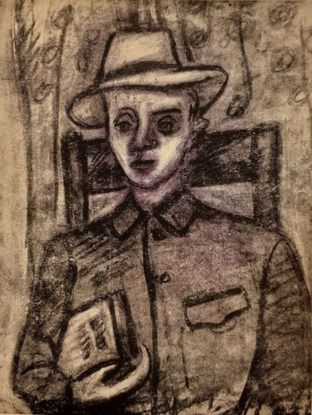 Curator: Here we have Bela Czobel’s Fiu Arckép from 1925, an example of his exploration with figuration using charcoal on paper. Editor: The first impression is one of melancholy; a certain stillness that pervades the portrait. There’s an almost ghostly quality to the charcoal rendering, especially around the eyes and background. Curator: Czobel's position within the Nagybánya artists' colony in Hungary situated him amid shifting cultural landscapes of early 20th century. What this piece offers is an insight into Czobel’s response to contemporary anxieties regarding Hungarian identity and social fragmentation following the Great War. The figure seems caught between tradition, signified by his modest dress and hat, and the uncertain future represented by the rather haunting Expressionistic style. Editor: Expressionism certainly comes through. The distortions and exaggerations, though subtle, communicate a sense of inner turmoil, almost claustrophobia. The lines around the eyes, for example, are intensely dark, contributing to a gaze that seems both penetrating and vulnerable. I find it striking how Czobel’s choice of charcoal lends itself to a sense of immediacy and rawness, reflecting perhaps the emotional climate of the period. Note how the composition guides the eye directly to the face of the figure, a choice which underscores the focus on interiority. Curator: Absolutely. If we consider the social upheavals in Europe during that era, Czobel’s choice to depict this figure through an expressionistic lens gains added resonance. It serves as a visual record of lived experience amid displacement. The figure seems suspended, trapped, and very alone, reflective of the psychological effects of social restructuring. Editor: Indeed. The expressiveness isn’t simply stylistic. The figure’s position with the book clutched suggests a connection, perhaps a seeking of meaning in this turmoil you speak of, and also possibly alludes to something being intentionally obscured, too. Curator: His artistic rendering asks: how did these events sculpt individuals, shaping not only their realities but also their sense of self? This approach pushes the boundaries of traditional portraiture, making a profound statement about individual agency amidst societal upheaval. Editor: Examining Czobel's Fiu Arckép, it seems the piece stands not just as an aesthetic object but as an open text ripe for decoding regarding historical context. Curator: Precisely; and when paired, those structural nuances reveal this moment's cultural and historical context.