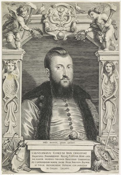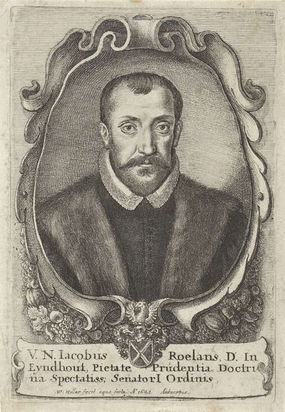 Curator: Here we have a print of "Garzia de' Medici," attributed to Adriaen Haelwegh. The date is estimated sometime between 1666 and 1761. It's an engraving on paper. Editor: There's something somber, yet regal about this portrait. The man’s intense gaze almost feels as though he's looking right at me across time. It’s incredibly detailed for a print, so vivid! Curator: Well, let's consider the materials. Engraving allowed for a level of detail previously unachievable. Prints democratized art; they allowed images of the elite, of historical narratives, to circulate more widely, shaping perceptions and consolidating power. Editor: It strikes me, too, that framing the image in that garland oval, that the engraver is actively shaping Medici’s presentation—literally containing him within the artwork and within history. Was this artist shaping Medici's legacy through distribution and material culture? Curator: Precisely. Consider how printmaking transformed artistic production. Instead of a unique painting viewed by few, multiple identical images could reach a larger audience. It's about dissemination and reproduction affecting Medici’s own cultural position. Editor: Almost like image politics avant la lettre? I can also read this image like theater in this case. This rendering looks hyperreal, not just for showing, but to move an audience through this spectacle. The text inscribed, it reads both propaganda and a form of political play. Curator: Yes! And think about the labor involved. The engraver had to painstakingly translate an image, reversing it, and committing it to the plate. It was a craft. What materials, what workshops did Haelwegh require? How much influence did the patron have? Editor: When you think of the act of distributing it and how history sees Medici today... is it really fair, or constructed on a narrative dependent on materiality and the distribution? So many hands must have worked in service to get it just right for patrons to mass reproduce the Medici's legacy. Curator: Absolutely. We see how the art market intertwined with propaganda, the cult of personality, and even early forms of advertising. Editor: Considering this lens of how art can reveal socio-political systems and manufacturing in early circulation culture, the act of print can become subversive. And, in turn, make it political and accessible for viewers to experience how that impacts them, even today! Curator: So true, looking at the labor that is involved and at who it benefits makes for a very nuanced story that makes us reflect on who or what this really serves.