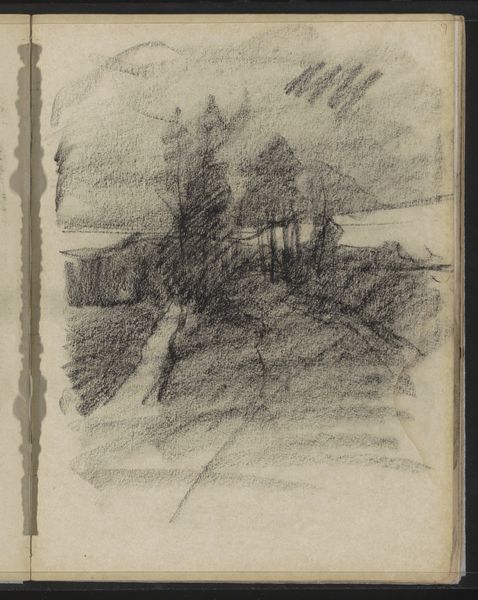 Editor: This is "Landschap bij Beek," or "Landscape near Beek," by Willem Cornelis Rip, likely created sometime between 1892 and 1898. It's a drawing, a pencil sketch on paper. I'm immediately struck by its looseness, the unfinished quality...it feels so immediate, almost like a glimpse into the artist's mind. What captures your attention about this piece? Curator: That's a beautiful observation. The intimacy is what gets me, too. Think of Rip, outdoors, sketchbook in hand, capturing the essence of the scene. The very light pencil work, the suggestive lines rather than precise detail… It reminds me of trying to capture a fleeting dream before it vanishes. Notice how he uses shading to suggest depth, yet leaves so much to the imagination? Editor: It's interesting you say dreamlike. I was also thinking about memory, how we only hold onto fragments. Is that a fair association to make? Curator: Absolutely. This wasn’t meant to be a finished product, hanging in a salon. This was a personal record, a way of engaging with the world. Imagine Rip pausing on his walk. He notes the key elements— the shapes of the trees, the light filtering through leaves—and commits them to paper. Does that personal, sketchy feel give you any other thoughts or associations? Editor: I think it does feel very modern in a way. It’s not about capturing reality perfectly but something more like capturing the impression. Curator: Precisely! This leans toward the Impressionistic ethos. Capturing the feeling of a place, a moment, not just its literal appearance. I like the way it suggests the trees reflecting off a river too. What a dreamy fleeting moment to capture. Editor: I see that so clearly now, looking closer at those hazy shapes at the bottom. Thank you. It's amazing how much information and feeling can be conveyed with such simple lines. Curator: Exactly! That’s the magic of a sketch – a whispered secret on paper. And the way it can evoke a feeling, not just describe a scene… beautiful isn’t it?