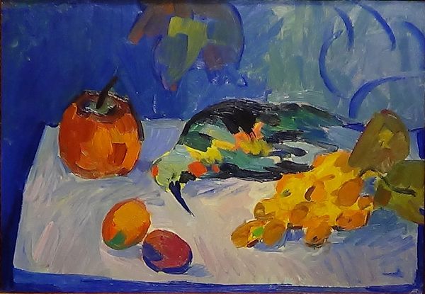 Curator: Good morning. I’d like to introduce you to János Kmetty’s “Fruits in Blue Bowl” from 1927. It’s an oil painting displaying a still life. Editor: It strikes me immediately with its hushed tones. The cool blues almost overwhelm the oranges and yellows. It feels both calming and subtly unsettling. Curator: Indeed, blue dominates—the bowl, a nearby porcelain teapot, the tablecloth... These repeated blues feel like a coded reference. Perhaps linked to melancholia, to the symbolism of home and hearth slightly obscured by the abstraction. Editor: Interesting. I'm more drawn to the texture; you can almost feel the thickness of the oil paint, particularly in the highlights. I’m thinking about the artist's labor here, the build-up of layers upon layers. It gives a tactile quality to this otherwise ordinary scene. Curator: And what of the arrangement itself? The careful placement of each fruit seems intentional, perhaps hinting at balance and order disrupted, maybe even referencing the artistic still-life traditions that came before Kmetty. What does it say about Modernism's place and role in society at that time? Editor: For me, it’s about the quiet revolution happening in art production. A rejection of perfect realism, yes, but also embracing the imperfect, the tangible act of painting. I wonder how he sourced his materials, how those blues were made, and where that bowl might have been crafted. Curator: Your focus brings another dimension to the forefront, challenging the traditionally passive consumption of artwork by emphasizing the tangible act of creation. Thinking about production adds new dimensions. Editor: Exactly. It shifts our perception, perhaps. And on a personal level, looking at the artist’s hand within his medium can influence a greater appreciation for the object and its inherent qualities, or at the very least to question art and its relationship to life. Curator: I see your point, examining the materiality alongside the artistic vision definitely creates a fuller sense of connection. Thank you for enriching our perspectives this way. Editor: It's been a pleasure. Every object holds its story; sometimes, it simply requires the right focus to discover it.