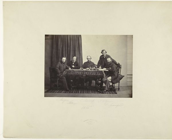 Editor: Here we have an intriguing photographic print, "Groepsportret van het Central International Committee of the Young Men's Christian Association in Genève, Zwitserland," created before 1895 by an anonymous photographer. I'm struck by the formality and the arrangement of the figures; the composition seems quite deliberate. What aspects of its construction do you find most compelling? Curator: Indeed. If we consider the interplay of light and shadow across the gelatin-silver print, we note how it models the faces, drawing attention to their features. Observe, too, how the composition is arranged: seated figures grounding the image while the standing figures behind provide a backdrop that suggests institutional power. Editor: I hadn't considered the positioning quite that way. Does the texture or materiality of the print contribute to your interpretation? Curator: Certainly. The gelatin-silver process yields a smooth surface with a wide tonal range. This enhances the clarity of detail and contributes to a sense of realism but it also presents a certain aesthetic distance. Note how this smooth surface contrasts with the rough textures evident in some of their clothing and the furniture surrounding them. Editor: That's a fascinating detail! How can contrasting these two qualities aid an understanding? Curator: These juxtapositions reveal layers within the photograph, suggesting complexity, in ways which may reinforce ideas about power structures within organizations or challenge expectations from viewing what seems to be just a document. Close inspection yields nuances easily missed during cursory consideration. Editor: Thank you, I've learned that attending to such intricate details allows richer understandings, and new questions. Curator: I concur. Scrutinizing art through such analytical lenses often provides a nuanced appreciation far removed from surface impressions.