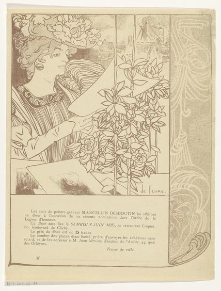 Curator: Look at the density of lines! Ernőné Déry created this woodcut in 1934. It's titled "New Year's Wish." Editor: There's such an intricate, almost fairytale-like quality to the composition, yet something also feels unsettling about the crowding in this tiny space. Curator: The New Year's message inscribed wishes that the "new shoots may bring forth more beautiful flowers, more fruit". Let’s explore that optimism through the lens of its historical setting. Think about interwar Hungary: How might these wishes resonate against the socio-political backdrop of the time? Editor: I find myself reading against that very optimism given what we know. Was this artist part of any artistic movements of the time? Where did Ernőné Déry exhibit and how did her work, generally, receive wider visibility or recognition? The choice of a somewhat laborious, slow process for a new year greeting speaks to a time far removed from digital messaging, reflecting potentially different socio-economic strata of communication, I’d argue. Curator: Her works were part of several group exhibitions in the late 1920s and early 30s, largely shown in Budapest. We have this print as part of a wider holding acquired relating to social documentary material connected to everyday life during this period. The lines themselves lend to this atmosphere - dense and almost trapping some symbolic potential. Editor: Right! It almost contains, visually, the potential energy of the "New Year's Wish" – the expectation and anxiety, but ultimately the boundedness of social circumstances which will inform how one interprets, consumes, and experiences something like "happiness" or "hope". Curator: I'd agree, considering the tree with the grafted numbers alludes to a sense of both cyclicality and history itself becoming superimposed on the "natural". It's fascinating how Ernőné Déry infuses the personal and symbolic. Editor: It also urges us to consider a far more critical view of social history, I think, of the public life that artworks inhabited in their own time – prompting the question of art as wish fulfilment and of hope.