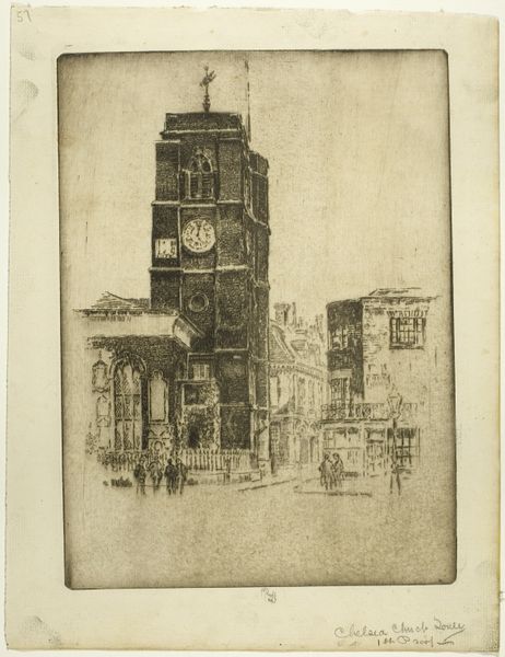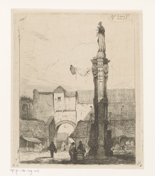 Curator: Let's consider this piece titled "Bazaar en moskee in Tunis" by Vicomte Arthur-Jean Le Bailly d'Inghuem, created around 1875. It's an etching, ink on paper. Editor: My immediate impression is one of delicacy and a slightly faded grandeur. The fineness of the etching lends itself well to depicting architectural detail. Curator: Indeed. As a product of its time, the etching participates in a larger discourse around Orientalism, and it prompts us to consider how 19th-century European artists visually constructed notions of the East for a European audience. Consider the institutional frameworks, the art market... all shaping what was deemed "exotic" or "worthy" of artistic representation. Editor: From a material perspective, it’s interesting to consider the artist’s access to these sights, the modes of transportation available to him, and then the technical skill to translate what he saw into the repeatable form of an etching. Each line, each shadow represents labor and decision-making. It makes you wonder about the process. Was this based on direct observation or sketches? Curator: And consider where and for whom the etching would have been sold or displayed. Was it circulated among fellow artists, or was it destined for a bourgeois parlor, feeding a specific kind of colonial fantasy? These kinds of images certainly played a role in the West's cultural understanding—or rather misunderstanding—of the Arab world. The mass reproduction allowed the easy spread of these constructed ideals. Editor: The reproducibility factor is key. The original experience, the very real Tunis with its vibrant sensory input, is processed and filtered. And the work's value lies not just in artistic vision, but the potential for disseminating that image widely through paper and ink. Curator: It certainly prompts questions about authenticity, the artist's intention versus its societal impact. How can we, as viewers today, confront the image’s potentially problematic roots while acknowledging its artistic merit? Editor: It’s a reminder of art’s capacity both to capture a moment and to participate in power dynamics, to shape and to reflect larger societal forces. A small etching like this encapsulates a far larger world, materially and ideologically.
