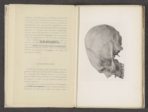 Editor: Here we have an intriguing gelatin silver print entitled "Caretta schildpad," made before 1893 by an anonymous photographer. It depicts a turtle displayed on the right-hand page of an open book. The stark presentation makes me wonder – what am I really looking at here? What's your take on this? Curator: This photograph invites us to consider the means of production and consumption, specifically the ways natural specimens were treated and represented. Consider the turtle: removed from its habitat, posed, photographed, and then reproduced as a print within a book. This process transforms a living creature into an object, a commodity to be studied and consumed visually. What does this tell us about the late 19th-century scientific gaze and its impact on the natural world? Editor: So you’re saying the photograph is less about the turtle itself and more about how it's being presented and used? Curator: Exactly! The materials - the gelatin silver print, the paper of the book – and the labor involved in creating them are crucial to understanding the artwork’s meaning. Also, the book format itself, enabling mass distribution, turns knowledge into something that can be bought and sold. What social structures supported this kind of representation? Editor: It’s fascinating to think about it that way, framing the artwork as a product of very specific social and material conditions rather than just a straightforward image. The anonymous authorship further obscures the individual’s labor while highlighting the industrialized processes. Curator: Precisely. This anonymous depiction reveals the systems that allowed the piece to exist and be widely distributed. We need to consider this mode of still life not only as aesthetic admiration, but as consumption, of turning organic life into product, for scientific purposes or something else entirely. Editor: I see, it changes the way I think about the purpose and impact of these images. Curator: Indeed. And that awareness transforms how we understand not just this particular image but the broader history of representing the natural world.