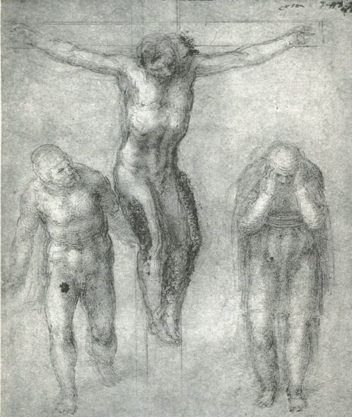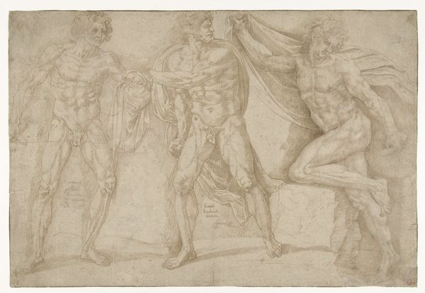 Curator: Here we have an 18th-century drawing, simply titled, "Group of Nude Figures," an intriguing piece residing here at the Metropolitan Museum of Art. Editor: Wow, there's a strange almost unsettling stillness to it, isn’t there? Like classical statues caught between poses, about to move. Is it just me, or is there also this slight echo of drama—melodrama, even—in the way the figures relate to each other? Curator: Note how the anonymous artist utilizes primarily pencil, rendering the human form with precision but also a softness, which might contribute to the slightly ambiguous feel you're picking up. The gray paper certainly influences the overall tonality and affects the reading of light and shadow. Observe the classical contrapposto present in several figures. Editor: The cloth draping feels heavy, like it’s been through a Greek tragedy laundry cycle. And something about the woman’s stance, holding that giant club or branch... Is she like, an ancient proto-weightlifter, bored in between sets, discussing metaphysics with her gym bros? Curator: One could suggest these are studies after antique sculptures, perhaps undertaken in an academic setting. See the emphasis on musculature and idealized forms typical of that period’s artistic training. The relatively muted emotional expression across their faces pushes it more towards formal exercise than narrative drama, doesn't it? Editor: Sure, but even the most stoic form hides a feeling! The subtle, you know, yearning for something. That reaching hand on the right, for instance. It feels almost charged. Also, can we talk about the complete lack of background? It amplifies that feeling of isolated figures, you know, on some existential stage. Curator: Certainly, that negative space heightens the focus on the figures themselves. We could also consider how the subtle variations in shading, the faint hatching, work to delineate depth, and volume despite a relative flatness of composition. Editor: This reminds me of art school figure drawing. Endless hours in some dusty studio, and afterwards grabbing a pizza talking about the subtle power dynamics, that show in every gesture. And even these characters on paper carry all that too! Curator: Indeed, reflecting on it now, it offers not only a look into classical form, but something about timeless human connections. Editor: It’s that strange mix of grand ambition, combined with really simple everyday stuff... always what art school –and great art is all about, don't you think?