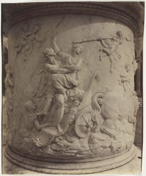 This is a corbel made by Giuliano da Sangallo. Although undated, we know it was likely made somewhere between 1445 and 1516. Carved from stone, the artwork presents a symmetrical composition, dominated by three figures and dense foliate designs. The central figure stands frontally, flanked by two winged figures in dynamic poses. Here, the artist employs classical motifs to explore the revival of antiquity. The sculptural form of the figures and the stylized acanthus leaves reference ancient Roman art. The balanced arrangement, with its emphasis on symmetry and proportion, reflects a humanist interest in order and harmony, ideas which dominated Renaissance thinking. Consider how the artist's choices in representing the human form and decorative elements interact. The corbel exemplifies how Renaissance artists integrated classical forms with contemporary ideas, creating a visual language that spoke to both ancient ideals and current intellectual pursuits. Through its structure and symbolism, this corbel embodies the complex interplay between past and present, challenging us to interpret its cultural and philosophical implications.