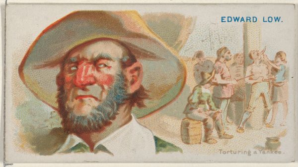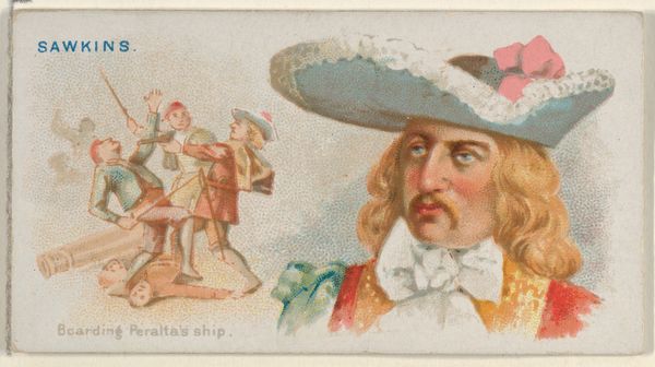 Editor: This print, "Jack Avery, Capturing Ship of the Great Mogul," dates to around 1890 and comes from a series made for Allen & Ginter Cigarettes. It's rendered in colored pencil, and there’s something almost…fantastical about it. What is your take on a work like this? Curator: What strikes me immediately is its existence as a commercial product. Cigarette cards, like this one, were essentially miniature advertisements masquerading as collectibles. Consider how this image of a pirate, someone operating outside the bounds of law and order, becomes sanitized and romanticized. It reflects a broader societal fascination with the exotic and dangerous, filtered through a lens of Victorian morality and consumer culture. Editor: So, the violence depicted, it's almost…staged? Curator: Precisely. And who is consuming this imagery? It's likely a middle-class audience, participating in a culture of collecting and display, which also shapes their understanding of history and morality. How does the print medium impact its distribution? Editor: The cigarette card medium made the art extremely accessible compared to a gallery showing or privately commissioned portrait, right? The art is reproduced and distributed widely through commercial networks. Curator: Exactly. And the relatively small size encourages intimate viewing and individual ownership, shifting it away from the traditional grand narratives presented in history painting, yet solidifying specific interpretations in people's minds. What message do you think these cards imparted to the ordinary person? Editor: Maybe it provided a sense of adventure without risk, a sanctioned form of rebellion viewed safely within societal constraints? I see how understanding its original function transforms the way we perceive it today. Curator: Precisely. Studying the socio-political implications embedded within something as seemingly trivial as a cigarette card reveals a great deal about cultural values.