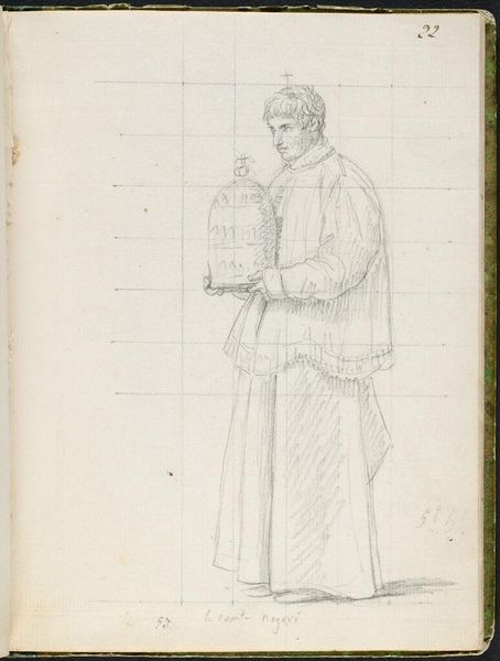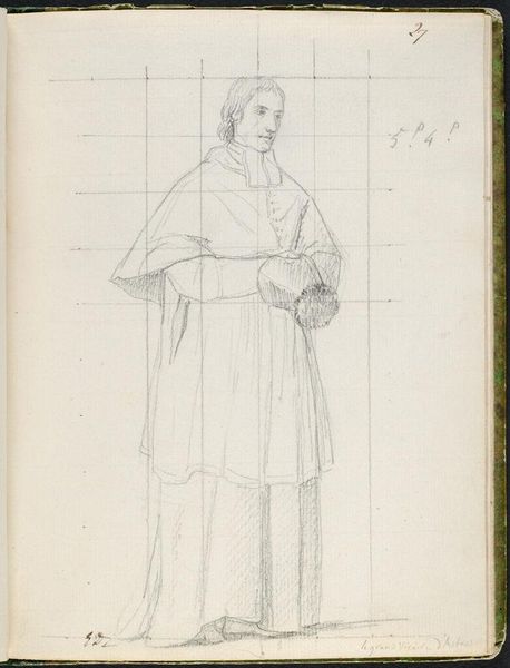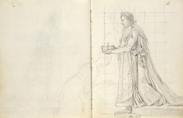 Editor: This sketch, "Two Clerics" by Jacques-Louis David, shows two figures drawn in pencil. I’m struck by the artist’s preparatory grid—what does it reveal about the process of making this work? Curator: The grid foregrounds David’s concern with production. We can see how he methodically approached the problem of representing the figures, breaking down the labor of image-making into discrete steps. It also speaks to the social context; the church's role and presentation, rendered through the deliberate choice of materials. Editor: So the materials and method are as important as the subject? Curator: Precisely. The sketch itself becomes a document of artistic labor and the social structures that support it. Editor: That's a really insightful way to look at it; I never thought about process that way. Curator: Understanding the means of production changes how we value the final product.