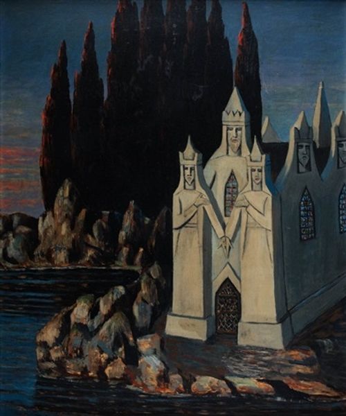 Boleslas Biegas made this painting, called "Bay", with oil on canvas. Look at the way Biegas layers those blues and browns, really building up a mood, a sense of foreboding. It's like he’s not just painting a place, but a feeling, a memory. I am drawn to the texture in the rock face, and how the paint is so thick in some areas you can almost feel the weight of the place. Then your eye travels up to the building in the center, flanked by those strange looming trees. Are they trees, or figures? How the sky is an ominous blue, but then you see the little squares of bright yellow in the windows, and it feels like a little bit of hope amidst the gloom. It’s so weird, but it’s the kind of weird that sticks with you. Like looking at a Magritte painting. You can almost feel his presence in the work, and you know that is the beginning of something interesting.