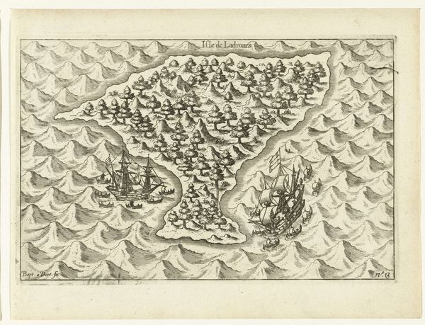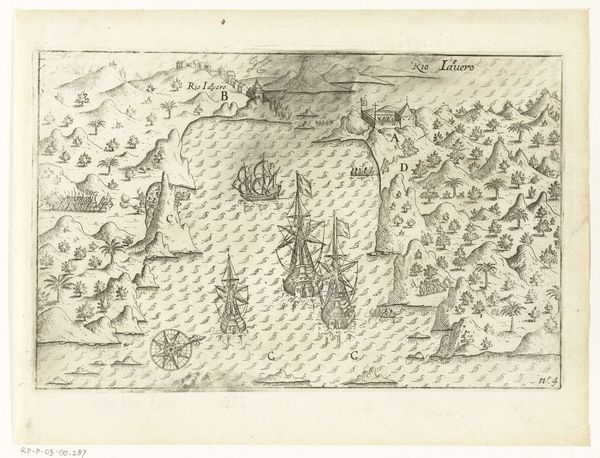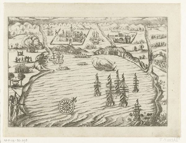 Baptista van Doetechum made this print titled, "Beschieting van Portugezen op Principe, 1598" using engraving. This is an intaglio printmaking technique where the design is incised onto a metal plate, usually copper or zinc. The artist would have used a tool called a burin to cut lines into the plate's surface, creating grooves that hold ink. After inking the plate, the surface is wiped clean, leaving ink only in the incised lines. Damp paper is then placed on the plate, and both are run through a high-pressure printing press. The pressure forces the paper into the inked grooves, transferring the image onto the paper. In this print, the precise, deliberate marks of the burin lend a documentary feel, reflecting the era’s focus on exploration and conquest. The image, far from a neutral record, is shaped by the labor of its making and the politics of its time. It reminds us that all images, no matter how seemingly objective, are made with a point of view.