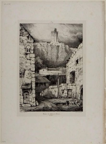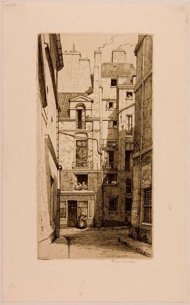 Curator: This is Charles Wheeler Locke's "Street Scene," a somber view rendered in shades of grey. I find it immediately oppressive. Editor: The composition certainly evokes that. The looming buildings and the way the artist uses light and shadow create a sense of confinement. Curator: Locke was deeply involved with the art scene during the Harlem Renaissance, though his social realism often focused on working-class struggles beyond Harlem itself. This print, with its urban grit, speaks to those concerns. Editor: Yes, and look at the texture – the cross-hatching gives a tactile quality to the architecture, almost as if you could feel the dampness of the stone. Curator: Considering Locke's political leanings, one might interpret this as a commentary on urban decay, a reflection of the societal neglect experienced by marginalized communities. Editor: Or perhaps it's simply an exploration of form and light? The dramatic contrast and the way the lines converge draw the eye, regardless of any specific social context. Curator: Fair point, but it’s hard to divorce any artwork from the socio-political milieu of its creation. Editor: True, but in the end, it is that interplay of technique and composition that holds my attention. Curator: A perspective I can certainly appreciate.