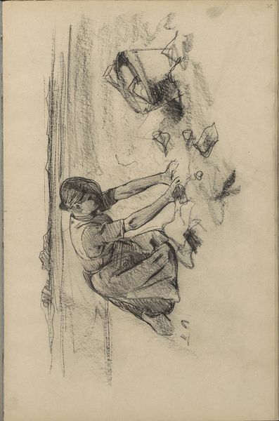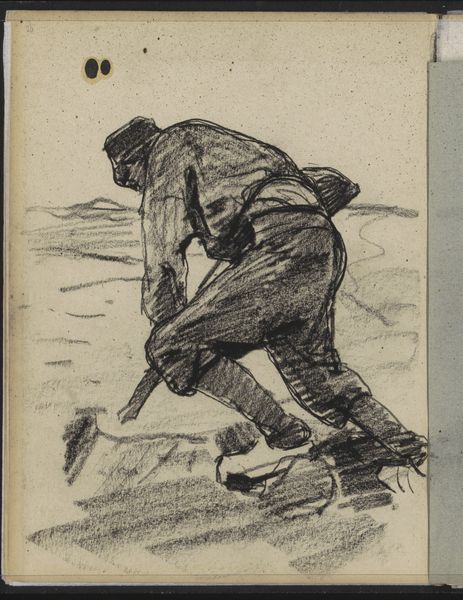 Editor: We’re looking at "Man met opgeheven bijl" - or "Man with Raised Axe" - a drawing by Willem Witsen from around 1884 to 1887, using graphite and pen and ink. It's a dynamic sketch, and the figure's pose is quite striking. What catches your eye in terms of the composition itself? Curator: The dominance of line, immediately. Observe how Witsen employs a frenetic hatching to model form, a technique particularly evident in the rendering of the figure's torso and legs. Note also the interesting spatial ambiguity he creates, refusing to fully delineate the background from the figure. This flattening effect collapses depth and forces us to confront the materiality of the drawing itself. Editor: So, it's more about the mark-making than depicting a scene realistically? Curator: Precisely. While a representational element exists, the real subject is the interplay of light and shadow conjured through Witsen's particular vocabulary of marks. Ask yourself, how does the gestural quality of the lines convey a sense of movement and potential energy, almost violence, even in this static image? Editor: That makes sense. I was focused on trying to understand the context of a man with an axe, but I see that the impact really comes from how the artist used the materials and the tension between the forms. Curator: Indeed. The subject, while present, is almost a pretext for a study in form and texture. The axe, for instance, is less a functional object than a compositional element balancing the figure within the picture plane. It creates this diagonal that supports and contains the entire figure. Editor: I see it now! Looking at it purely as an arrangement of lines and shapes, it's much more powerful. Thanks for pointing that out! Curator: My pleasure. Hopefully, considering art through a formal lens, one can find renewed meaning.