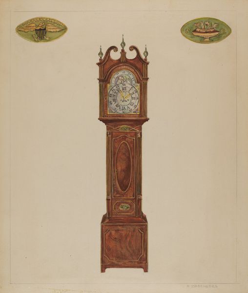 Curator: Hello and welcome. Here we have Lawrence Phillips’ "Clock," a decorative drawing from 1936 rendered in coloured pencil. What’s your initial reaction to it? Editor: Well, immediately it feels a bit whimsical and melancholic, like a forgotten stage prop from a very genteel puppet show. The muted tones and decorative floral elements are quite lovely but suggest perhaps the artist had a subtle unease regarding time and beauty, and our relationship with those forces. Curator: That’s interesting. The decorative arts movement certainly grappled with those ideas, responding to industrialization with handcrafted beauty intended for the everyday. It's like it's trying to redeem domesticity through its application in a common item like the clock. The flowered decoration could express the comfort to be found in the slow change of seasons, not mechanical time, and the futility of time. Editor: Yes! I find that tension compelling. I’m intrigued by what appears to be a small picture frame set at the bottom—another captured moment nestled within time’s relentless march. It looks a bit like looking into a very foggy or dusty memory. Did Phillips work primarily in drawing or in different media? Curator: Phillips was primarily a draftsman, so this level of detail is typical. One thing that this drawing also makes me think about, is the role the home plays in giving meaning and providing comfort in our everyday lives. How does time work and play differently in a private space compared to a public one? It’s worth remembering that this artwork was made during the interwar years. So many expectations were disrupted for millions. And clocks mark our lives! Birthdays, weddings...death. So a flowered and decorated clock offers a kind of promise, one the public clock may not deliver on. Editor: A private ritual amidst a public crisis – that resonates deeply! Almost a declaration of autonomy, adorning the domestic space. So, for me, seeing this drawing really boils down to reclaiming personal time, transforming it with flowers and care so it is not a relentless thing of pressure and despair. Thank you! Curator: A beautiful note on which to conclude. Thank you.