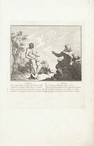Curator: Here we have "Piro helpt Arlequin bij het overgeven," which translates to "Piro helps Harlequin to vomit." This engraving dates to between 1720 and 1728. It’s quite a scene, wouldn’t you agree? Editor: Absolutely—a striking composition. The starkness of the engraving medium heightens the visceral and rather unpleasant moment depicted, while the dynamic interplay between the two figures holds one's gaze. Curator: Tell me more about that dynamic. What do you see? Editor: Well, Harlequin, the main figure, is obviously in distress, leaning forward, being supported—or perhaps restrained—by Piro. Piro’s role seems ambiguous, caught between aid and control. I wonder about the intent behind this scene. What symbols might inform its narrative? Curator: I am particularly drawn to the archetypal symbolism of Harlequin, who carries centuries of baggage. Rooted in the Commedia dell'arte tradition, Harlequin, with his checkered costume, is traditionally the cunning servant. Here, however, he is vulnerable. His sickness presents an inversion, perhaps critiquing established social roles and hierarchies. Editor: I concur. Piro, less recognizable to the contemporary eye, then becomes even more intriguing in relation to this ailing Harlequin. Is there perhaps commentary on compassion or betrayal buried here? Does Piro, by aiding in this…unpleasantness…facilitate a cleansing or further corruption? Curator: The composition seems deliberately staged, drawing our attention not only to action, but the stylized poses of each figure. They exist in a curated space, against what seems to be deliberately constructed rolling landscape with somewhat formulaic clouds—further emphasizing a contrived or symbolic narrative, or allegory of some kind. Editor: It seems this work transcends the boundaries of mere genre painting and strives for layered and metaphorical interpretations of society and its inhabitants. Curator: Precisely, its success derives from this inherent ambiguity. There are no easy answers, leading to continued reflection. Editor: Yes, indeed—the beauty lies not only in technique but its provocation. Thank you for your insightful observations.