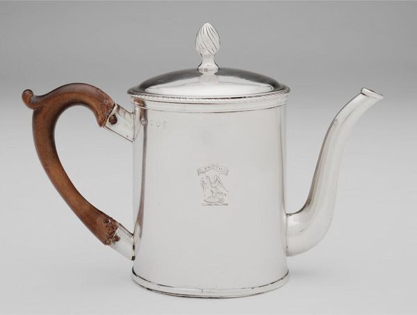 Curator: Right, so this is a teapot, crafted by John Troby. We don't have an exact date for it, but Troby lived from 1787 to 1805. Editor: It’s so stark, isn't it? Almost severe in its simplicity. The wood handle offers a warmer contrast to the cool silver. Curator: Silver and wood, a deliberate choice, I think. Consider the labour involved in each material, the mining and the silversmithing versus the carving of the wood handle. There's a whole social hierarchy embedded in that contrast, right? Editor: Absolutely! It also strikes me that the object seems a little… joyless, for a teapot. It’s elegant but perhaps too restrained. I wonder about the person who would have used it. Curator: Maybe they preferred their tea with a side of quiet dignity! Editor: Well, I guess every object tells its own story of labor and luxury.