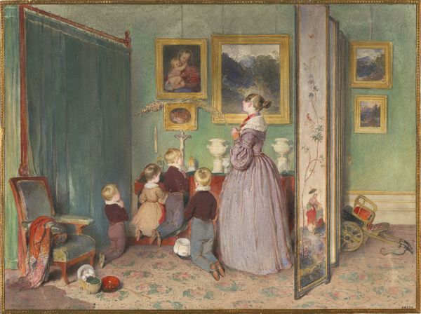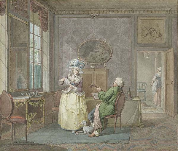 Editor: This is "La Soubrette Confidente" by Nicolas Lavreince. I find the composition quite intriguing with its arrangement of figures in an intimate setting. What do you see in this piece? Curator: Indeed. Observe how Lavreince employs a subtle palette, primarily blues, pinks, and creams. Notice the intricate rendering of fabrics, especially in the seated woman’s dress. The artist's masterful use of line and texture creates a delicate yet engaging visual experience. Editor: I hadn't considered the textures so closely. It does create a sense of depth. Curator: Precisely. The interplay of light and shadow across the figures emphasizes their forms, contributing to the overall narrative. Consider how the artist uses the interior space to frame the subjects. How does this framing impact your understanding? Editor: It does add to the sense of intimacy and secrecy. Thank you for highlighting that. Curator: My pleasure. By examining formal qualities, we glean insight into the artist’s intent.