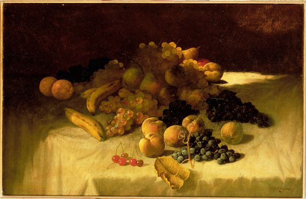Curator: Looking at John Wainewright's "Still Life with Fruit," completed in 1862, what strikes you most initially? Editor: The weight of it all! There’s an almost overwhelming abundance depicted; that dense arrangement of dark grapes, contrasted by the pale peaches, feels deliberately luscious. The artist presents the objects very realistically. Curator: The choice of elements within the frame and the overall visual presentation do provide a clear impression of wealth, or at least of luxury. Considering the time in which Wainewright created this work, that feeling ties back to cultural narratives around trade, accessibility to food, and class hierarchies within nineteenth-century society. These objects may seem banal, but the presentation is loaded. Editor: That's an astute point. Looking at it through a symbolic lens, I can't help but wonder what fruits might represent beyond mere sustenance. Are these allusions to things such as classical abundance, maybe ideas about paradise? Each fruit carries a tradition of art. Curator: Exactly! The historical lineage of still-life painting is unavoidable here. However, who had access to enjoy these pleasures? We might also consider the exploitative histories behind these imported items or those who made the attainment of these luxurious fruits and decorative arts available to the ruling class. How might we critically reconsider these types of work that can romanticize reality, in essence? Editor: That pushes back against this kind of classical trope by considering contemporary social implications of such art. We might recontextualize the visual appeal with a broader critique. The individual artist perhaps becomes less of the focal point than the art history they inherited and the socio-economic environment which supported their labor. Curator: The artist and art become documents of society, ultimately revealing to a viewer who mattered then and how power and social justice are maintained and sustained through visual media. Editor: Fascinating, truly. And the artwork can shift from pure appreciation to a locus point of discussions. Curator: Indeed, reframing older works to reveal historical contexts creates necessary discourse about art, ethics, and societal advancement. It can then move viewers to question all the visual information around us in media today.