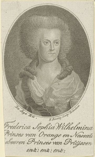Curator: Here we have Johann Christoph Sysang's portrait of Anna van Hannover, an engraving likely created sometime between 1734 and 1757. It's currently housed here at the Rijksmuseum. Editor: It strikes me immediately as somewhat severe, despite the ornate dress. There's a stillness to the composition, a formality emphasized by the tight cropping. Curator: It's fascinating how Sysang has deployed conventional iconography here. The inclusion of the coat of arms connects Anna not just to her personal identity but to the powerful political lineages of Orange and Great Britain. The very act of producing this engraving places her within a specific visual rhetoric of power. Editor: Absolutely. Notice the way the engraver's line emphasizes the sheen of the fabric, the texture almost tactile. Light seems to cascade across her dress, but the face is oddly flat, less worked somehow. Curator: Indeed, perhaps reflecting the period's emphasis on aristocratic facade. Every detail, down to the pearl embellishments in her hair, projects an image of flawless, unimpeachable royalty. It speaks volumes about the psychology of portraiture in that era. It reminds us of the expectation surrounding noble identity. Editor: There's also a tension created by the technical limitations. The medium is working against the artist, I feel. He struggles to imbue her expression with genuine nuance. But that in itself, could convey something beyond its pure visuality. It communicates restraint and perhaps that too signifies the dignity afforded to royalty in portraiture. Curator: The artist uses well-known devices to amplify an idea of status, but those decisions also impact how we perceive the subject across history. It's so compelling when we begin to disentangle all those layers of influence. Editor: Precisely! What began as an observation on formal technique ultimately illuminates larger ideas about societal representation. Thank you.