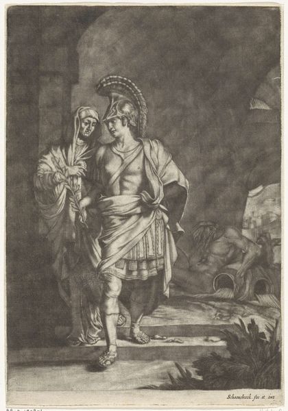 Curator: This etching, dating to about 1670, is titled "Aeneas and the Sibyl" and was created by Gerard de Lairesse. The scene depicts the figures stepping down into what appears to be the entrance of the Underworld. Editor: It’s struck me immediately how dramatic and somewhat gothic this depiction feels. The lighting and shading give such a sense of depth and foreboding to what I remember from Virgil's account in *The Aeneid*. There is such a palpable sense of destiny, fate. Curator: Indeed. Lairesse expertly uses light and shadow to create an emotionally charged atmosphere, echoing the psychological weight of Aeneas's journey. Consider the contrasting figures, too: Aeneas in his helmet and military garb signifies his duty and martial prowess, while the Sibyl shrouded in her robes embodies the esoteric knowledge of the divine. The figures on the left serve to contextualize this exchange. Editor: The contrast between these figures feels crucial for considering ideas around gender and power, doesn’t it? Aeneas, standing confidently as a near-nude warrior about to build the new world; the Sibyl veiled, wise, guiding but ultimately constrained by social expectations... Also, there’s that supine figure. Who is he? Curator: Some scholars have claimed that the figure, lying passively in the grotto is Cerberus, the monstrous guardian of Hades. It's such a brilliant detail for reinforcing the descent into the Underworld, where Aeneas hopes to speak with his dead father Anchises. He is not only the archetypal dutiful son, but his ability to appease Cerberus marks him as favored by destiny. Editor: Which, in the Aeneid is a foundational myth of Roman identity itself! Aeneas carries the weight of Rome’s future on his shoulders. His relationship with the Sibyl isn't just a divine consultation. I mean, their interaction hints at power dynamics woven throughout Western art history – the masculine hero guided, aided, and enabled by the feminine prophetess, always in a secondary position. I can't help but look at such scenes through the lens of modern discourse about power, gender, and history. Curator: Certainly, reading it through the context of these contemporary ideas reveals complex elements. It remains, after all, a very powerful image. The dramatic intensity that Lairesse has captured here draws us into Aeneas’s crucial meeting with destiny. Editor: Exactly, and recontextualizing the symbolism embedded in classical works enriches how we interpret narratives from the past.