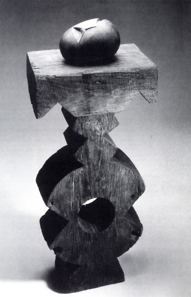 Douglas Abdell made this "Yad" sculpture from mixed media, and seeing it feels like stumbling upon some strange mechanical beast. The black and white, high contrast palette gives it an otherworldly, sci-fi feel, but the materials are so tactile, so real. Looking closer, the surface is a collage of textures. The smooth, almost reflective planes, give way to rougher, more matte areas. There's a tension between the geometric and the organic that I find really compelling, like the sculpture is caught between being a machine and something alive. Take that odd cylindrical shape, it seems functional, industrial even. But it’s also kind of comical, like a watchful eye staring back at us, or a cartoon mouth. This reminds me of the playful sculpture of artists like Jessi Reaves, who also brings an unlikely vulnerability to what we think of as rigid forms. In the end, it's this uncertainty, this embrace of multiple readings, that makes Abdell's piece so fascinating.