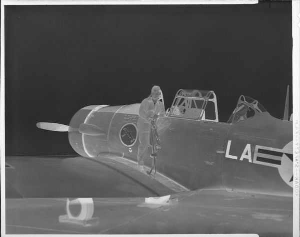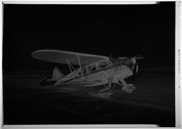 Editor: This is an intriguing gelatin silver print by Martin Schweig, it's called "Untitled (small plane on Robertson, MO airstrip)." I find the inverted tones quite striking. What compositional elements stand out to you? Curator: Indeed. The stark tonal inversions immediately draw the eye. Observe how the linear forms of the plane's wings and fuselage create a dominant diagonal axis, bisecting the composition. The negative space above contrasts sharply with the textured ground below, creating a visual tension. Editor: So, you see the tension mainly in the contrast between the ground and the sky. Curator: Precisely. Furthermore, consider the texture rendered by the gelatin silver process. The granular quality of the image adds a tactile dimension to the photograph, inviting closer inspection. Editor: It's fascinating how the technical aspects of the print affect the overall aesthetic. I'll definitely pay more attention to the medium itself. Curator: It reframes how we understand the photograph.