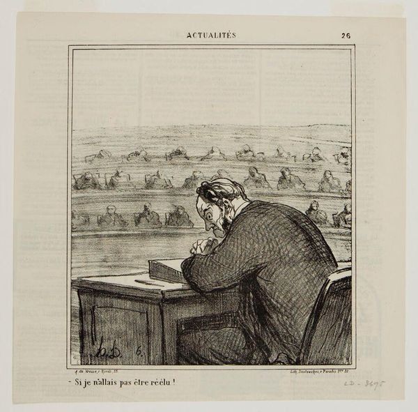 Curator: Oh, this lithograph really strikes a chord. It’s titled "Si je n'allais pas être réélu!", which translates to “If I were not to be re-elected!”, crafted by Honoré Daumier back in 1869. Editor: My goodness, he looks tormented. That concentrated stare, clasped hands—he practically vibrates with anxiety. It's a really claustrophobic composition too, with all those shadowy figures looming behind him. Curator: It is. Daumier, through works like this, became the social conscience of his era. He masterfully wielded caricature in prints, like this one, to scrutinize and challenge political figures and social mores, which were so important at that time in France. His works became integral to shaping public discourse through imagery. Editor: So, is this image meant to represent a specific political event? Or is it meant to act more generally? All of those figures almost read like a bad dream. They look so similar that it almost gives the feeling of one big judging amorphous shape that could either swallow you or support you. Curator: Not a specific event, but a widespread phenomenon. Think about the anxieties surrounding power and re-election during that period. Daumier keenly observed how politics affected everyday life. He captured universal human concerns – the fear of losing power and influence is obviously not specific to this era. Editor: Right, it resonates powerfully even now. I'm fascinated by the recurring motif of hands clasped in supplication. We find them in religious iconography, of course, signifying piety, but here, they convey vulnerability, fear. He could also be lying! I guess it depends on what people expected of their political representatives back then. Did people generally think them pious or untrustworthy? Curator: It is fascinating that you bring that up! Think of it this way: while Daumier indeed utilized established symbolic language, he does it with subversive intent. The artist is critiquing not only this individual's apprehension about being re-elected but the performative aspects of politics, the need to feign piety to maintain power. Editor: This adds a whole layer to how I'm taking it now, given how you explain his historical context. This caricature becomes more pointed, doesn’t it? That constant balance that has to happen when governing or representing a populous: being one of the people, but still a leader. That fear makes more sense now, like he's afraid that his performance won't hold water anymore. Curator: Exactly. It’s Daumier’s genius: reflecting anxieties around the political performance itself. He captured not only individual anxiety but mirrors of socio-political uncertainty and broader ethical questions in political leadership that ring true still today. Editor: A fantastic, if troubling, snapshot of the past. Thanks for unpacking its significance. Curator: My pleasure. Always a good day for considering political imagery's impact.