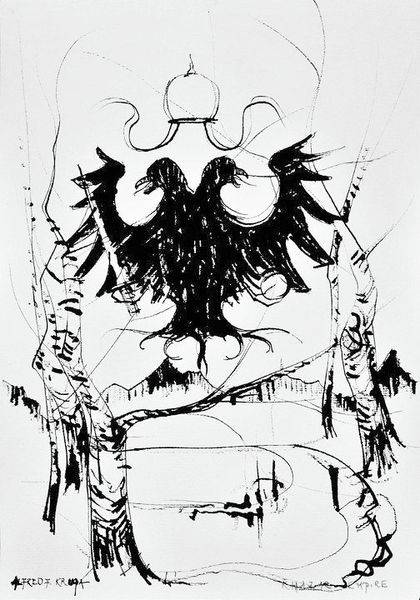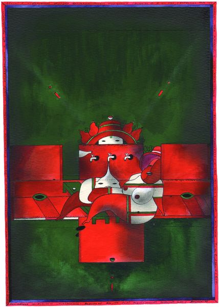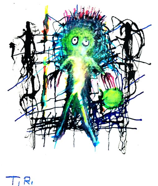 This is Thomas Riesner’s “Torture Prison”, 41 by 30cm. It seems to have been made with paint or ink, and maybe some kind of crayon or marker, too. The colors are limited - red, black, green, a little blue, and the off-white of the page. I’m really drawn to the raw immediacy here, how Riesner seems to be working straight from some feeling. Look how the red paint drips down the figure’s body, almost like blood or sweat. Then there's the scratching, frantic lines around the edges that seem to cage the figure. That electric green hair suggests there's something really alive and wild about to burst out of the form, even as it’s imprisoned. I’m reminded of some of Francis Bacon’s screaming figures, or maybe even some of the early German Expressionists. But Riesner’s got his own thing going on, a kind of unhinged, punk energy. It's not about being pretty, it's about being real, even if it's ugly. Artmaking as catharsis!