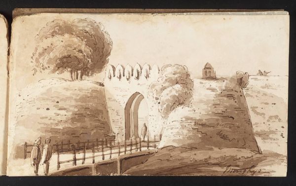 Curator: What a captivating study in greyscale. It’s titled "View of a Portion of the Stage and the Wall Behind It of the Theatre of Taormina," an etching with pencil by Louis Ducros, dating back to 1778. The Neoclassical elements really speak to that era's fascination with antiquity. Editor: It feels so…melancholic. All these crumbling ruins under a vast sky. It really emphasizes the ephemerality of human creation. The precision of the lines and the overall restrained palette create such a sense of loss and historical distance. Curator: I agree. Notice how Ducros uses the architectural structure to divide the space, leading your eye from the figures in the foreground back to the suggestion of Mount Etna in the background. The foreground is grounded in darker ink that thins out and becomes almost atmospheric the deeper your eye travels back in space. Editor: It's interesting how those figures, almost like a small theatrical troupe, are positioned near the theatre's decaying facade. Are they performers or mere visitors? I feel this location signifies the theatre’s importance and accessibility to people throughout the time since the artwork's creation. Curator: I think they really embody the Picturesque aesthetic—human figures interacting with ruins, sparking a feeling of reflection on history, nature, and our place within that. But if we want to focus on the image itself, notice Ducros’ expert rendering of textures: the rough stone, the smoother dressed architectural details and the almost cotton candy look of Etna against the clouds. Editor: Absolutely. I imagine these kinds of images circulated amongst those invested in classical themes. I like seeing those common themes continue, like art imitating the power structures, architectures, and other symbolic representations. I agree, it’s very cleverly laid out in how its forms create an interplay between time, permanence, and how political power manifests. Curator: Indeed. Ducros gives us more than a scene; he gives us a reflection on the passage of time through careful consideration of materials, space, light, and contrast, it really sings! Editor: An almost ghostlike theatre, still speaking to modern onlookers after many eras. What an incredibly effective way of understanding the ongoing relevance and changing perceptions of that historical stage.