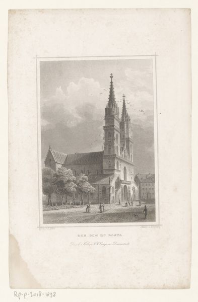 Editor: So, this is H.J. Hammer’s "Roskilde domkirke," created between 1815 and 1882. It's an etching and engraving, giving it this incredible, almost stark quality. It feels very… formal and a bit imposing, don't you think? What strikes you when you look at this print? Curator: The formality, as you say, speaks volumes. Look at the cathedral positioned centrally, almost like a monument frozen in time. But let's consider what a cathedral represents – not just a religious space, but a symbol of power, community, and cultural identity, particularly during the 19th century when national identities were being solidified. Does this depiction challenge or reinforce those power structures, do you think? Notice how people are on the lower right. Are they anonymous or rendered to create a certain type? Editor: I see what you mean. They seem… quite small and a bit anonymous actually, compared to the massive scale of the church. Does the church overshadowing them tell a story about societal hierarchy at the time? Curator: Exactly. Consider the social and political landscape of Denmark during that period. What role did the church play in shaping societal norms, gender roles, and even political discourse? This etching could be read as a commentary on the enduring influence of religious institutions. It might reinforce their symbolic value and the community they seek to unify. Now, does Hammer’s technique add to or detract from the social critique? The precise lines feel very controlled… Editor: Yes, that control almost makes it seem… idealized. So maybe it is a little less critical and more celebratory of the church’s endurance and importance? It makes me consider how art is rarely ever truly neutral; everything has a point of view. Curator: Precisely. And reflecting on art like this urges us to question how images shape our understanding of history and identity even today. Editor: I agree; thank you for providing this context.