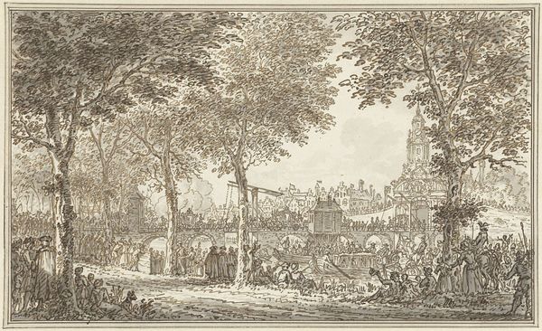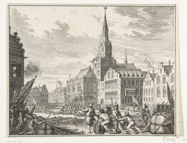 Simon Fokke's engraving captures Rennenberg's troops seizing Groningen in 1580, a scene dominated by the symbols of war and civic authority. The flags, muskets, and cannons signal the violence, while the architecture—the town hall topped with a weathercock—represents civic order. Look closely at the weathercock; this ancient symbol, often associated with vigilance and proclamation, has roots stretching back to early Christianity, where it represented the wakefulness of believers. It reappears throughout history, sometimes as a sacred emblem and, at others, as a secular symbol of watchfulness. Here, it presides over a scene of conquest, a subtle commentary on the shifting fortunes of power. This symbol, so familiar yet so deeply embedded in our cultural memory, engages us, reminding us of the cyclical nature of history. The weathercock watches silently as Groningen falls, a poignant emblem of the relentless turn of events.