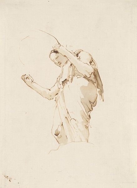 Giovanni Battista Tiepolo made this drawing of a seated figure in brown ink to capture a sense of dynamic movement and perspective. The figure's pose is striking; we view him from a low angle, which exaggerates his form and makes him appear monumental. Note how Tiepolo used quick, fluid lines to define the contours of the body, creating a sense of energy and spontaneity. The contrast between the darker, more defined areas and the lighter, sketchier parts adds depth and volume to the figure. Tiepolo employs foreshortening to create a sense of depth and realism. The raised arm, for example, extends towards us, drawing us into the scene and emphasizing the figure's presence. Through these techniques, Tiepolo not only captures the human form, but also engages us with its dynamic possibilities. This interplay of perspective and form is a testament to Tiepolo's skill.