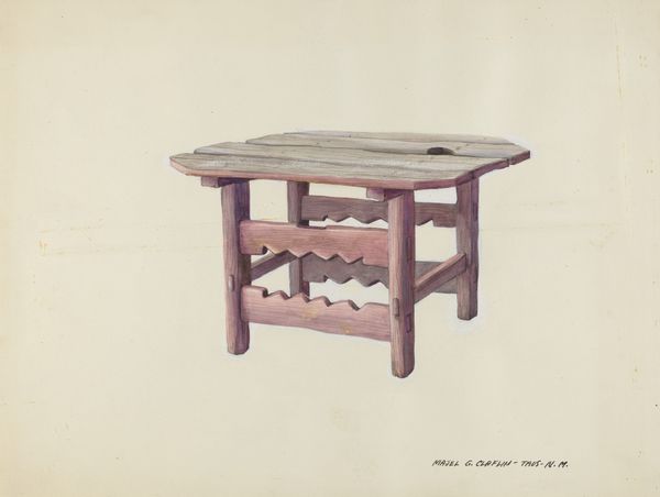 Editor: So, here we have Dayton Brown’s "Sanctuary Table," a 1936 watercolor, pencil, and charcoal drawing. It’s remarkably simple. It's just a table, plainly depicted, but the title hints at something deeper. What catches your eye about this piece? Curator: For me, the interest lies in the labor, both physical and social, embedded within this seemingly straightforward image. Brown meticulously rendered the table's joinery, the textures of the wood. Consider what making a table, a simple utilitarian object, represented in 1936, during the Depression. Were these handmade, potentially using salvaged or repurposed wood? Editor: That’s a good point, especially considering the title "Sanctuary Table". It could signify resourcefulness. Were such objects like this common subjects at the time? Curator: Yes, certainly. Artists working under the WPA’s Federal Art Project often depicted everyday scenes, celebrating the dignity of labor. But it is important to also analyze what kind of work it represents; labor involved in constructing, serving at, or gathered around this "sanctuary" table. Who were the individuals connected to this table, and how would it provide safety? The deliberate attention to detail transforms an ordinary object into a space that reflects economic realities and intimate human interaction. It provokes thinking about the stories this piece wants to tell, considering the materials and the purpose. Editor: It makes me look at the piece so differently, thinking about how a functional object can reflect a specific cultural time. Curator: Exactly. By acknowledging the labor involved in this piece, we broaden the historical context that highlights art and everyday life as connected. Editor: I now consider this simple, understated sketch to have a multi-layered depiction, hinting toward so much about American history during that period! Thank you!