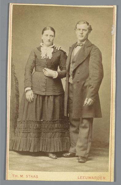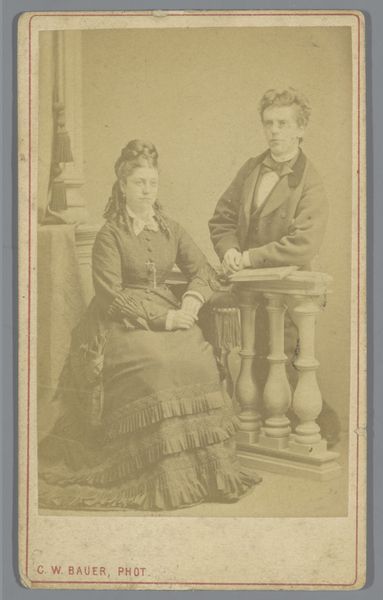 This is a photograph of an unknown man and woman made by Willem Gerhardus Kuijer. The photograph, with its muted tones, arranges the figures in a composition that speaks of formality and social structure. The woman is seated, holding a fan, while the man stands beside her, his hand gently placed on the chair. These poses are not accidental; they signify a careful construction of identity, using the visual language of photography to reinforce societal roles. Consider the way the light falls across their faces, emphasizing their expressions. These elements, while seemingly simple, create a complex interplay between the individual and the cultural expectations of their time. It prompts us to reflect on how we use images to define ourselves and our place in the world.