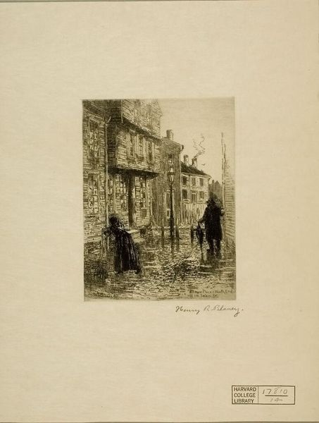 Curator: Welcome. We’re standing before Théophile Alexandre Steinlen's "Chemineau Traversant Un Village Endormi," a drawing from 1902 rendered in pencil and charcoal. Editor: My initial impression is… bleak. The palette is nearly monochrome, and the composition emphasizes a solitary figure trudging along a seemingly endless road. It speaks of isolation and perhaps economic hardship. Curator: Precisely. Steinlen was deeply concerned with social issues, particularly the plight of the working class in late 19th and early 20th century France. We see that concern manifest here in the presentation of a vagrant traveling with a walking stick and carrying a sack on his back, trudging along the edge of the street in a forlorn town. Consider the social structures that relegated people to such existence. Editor: Absolutely. And the materiality—the charcoal and pencil—further enhances the raw and gritty feel. There’s no pretension here. He is literally using inexpensive means to address class-based problems. It draws attention to his subjects by making art accessible through accessible material. Curator: The way he uses shadow is incredibly effective. Notice how the darkness looms not just overhead in the sky, but it permeates the road, nearly swallowing the figure. It represents, I think, the oppressive societal conditions bearing down on this person. Editor: True. But consider too how this seemingly simple technique elevates what would otherwise be a mere observation. It becomes imbued with emotional weight through the deliberate use and process of smudging, layering, erasing… all revealing a starkness to poverty and societal inequality. Curator: And the ‘sleeping village,’ a concept reinforced by the closed doors and shuttered windows, serves as a metaphor for society’s indifference towards those on the margins. A visual manifestation of systemic neglect. Editor: Yes, there’s a critical voice here, challenging viewers to confront the uncomfortable realities of the time. The very act of depiction can function as a social critique. I mean, look at how it has impacted the way you respond to this drawing now! Curator: Indeed, the piece invites us to reflect on questions of social responsibility and how art can serve as a vehicle for commentary. It encourages us to look beyond aesthetic qualities to appreciate Steinlen’s call for social awareness. Editor: Well, it also shows the value of raw material—how its simplicity and accessibility, worked by skillful hands, can create something profoundly meaningful. It connects with social history, but only through the tangible realities of material processes.