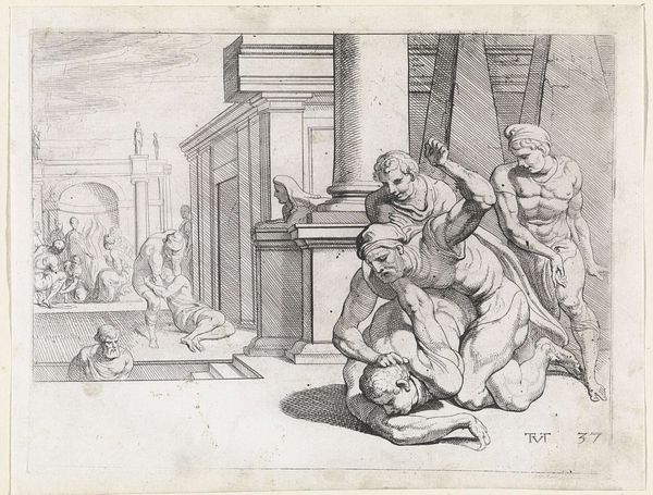 This etching, titled "Gevangenen in kerker," meaning prisoners in a dungeon, was created by an anonymous artist. The print depicts a group of prisoners in a sparse, stone cell. Some prisoners are engaged in games of chance, while others sit in despair. The scene offers a glimpse into the daily lives and emotional states of those incarcerated, reflecting broader societal issues of justice, punishment, and human rights. The lack of specific historical or personal context invites a more universal interpretation, prompting us to consider the psychological effects of imprisonment, and to reflect on our own emotional responses to confinement and uncertainty. It raises questions about individual agency versus systemic oppression. This print captures the complex interplay between personal experience and broader social structures.