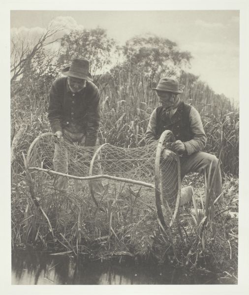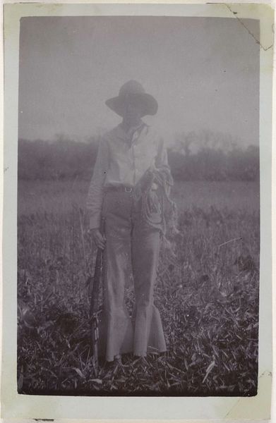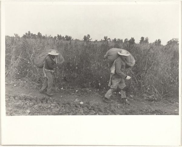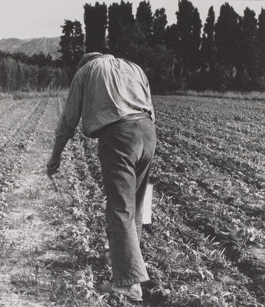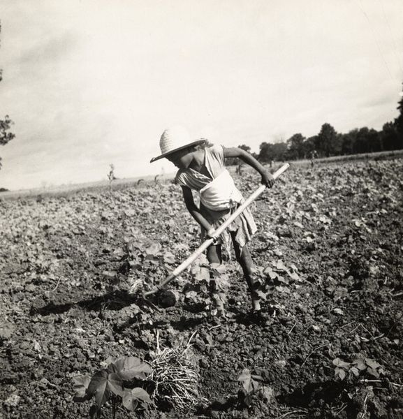Curator: Dorothea Lange's "South Carolina Sharecropper" captures a man working the land. The print measures about 18 by 19 centimeters and is currently held at the Harvard Art Museums. The image feels heavy, burdened. Editor: The weight of generations, perhaps? His tools, the plow—they speak of labor passed down, a cycle almost inescapable. It's about the dirt under his nails, not some pastoral ideal. Curator: Indeed. The hat shades his eyes, but they still look heavenward, perhaps with hope or resignation. It is a deeply symbolic stance of both the personal and the economic landscape. Editor: The materiality of his clothing, its wear and tear, speaks volumes about his socio-economic standing. The texture of the field, the raw earth—it emphasizes a life lived in close proximity to the land. The means of survival are etched into his very being. Curator: It also seems like the large hat might be a reference to the sun. Perhaps it could be seen as a halo, but a more practical, earthly version of it, tied to survival. Editor: Precisely. And in that tension between the practical and the aspirational, we glimpse the core of the sharecropper's existence. Curator: It's a potent reminder of the human cost embedded in our economic systems, captured in a single, striking image. Editor: Absolutely. It's a testament to Lange's ability to make the invisible visible through the stark beauty of human labor.