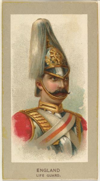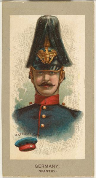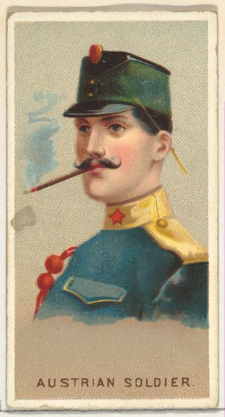 Curator: Right, let's turn our attention to "Infantry, Spain," a chromolithograph print created around 1881. It was part of a series of military uniforms issued by Abdul Cigarettes, and it’s currently held here at the Metropolitan Museum. Editor: My first thought? Oh, the melodrama! It’s theatrical, like a character plucked straight from an operetta. The rigid pose, that meticulously sculpted moustache – everything's screaming performative masculinity. Curator: Well, military uniforms themselves are inherently performative. Beyond practical concerns, they're loaded with symbolism. Think about the colors – red, blue and gold were specifically selected for their historic ties to the Spanish crown and military prowess. This isn't just any soldier, this is an idealized representation of Spanish infantry. Editor: And that's exactly what feels so staged. He's an emblem, not a person. Even the medium feels like part of the fabrication – watercolor gives it a soft, almost romantic feel, at odds with the reality of warfare. It almost glamorizes this person who probably dealt with daily unspeakable situations of war. Curator: It's important to remember the context, these were promotional items designed to sell cigarettes. The aim wasn’t necessarily historical accuracy or brutal realism. These cards fueled a culture of both casual patriotism and an appetite for exotic images, connecting consumers to faraway lands and military power, however fanciful. Editor: Fanciful indeed! But there’s something about the artifice that’s so telling. It reflects the social values and desires of the time, this carefully crafted illusion of strength and valor, reduced to a trinket tucked inside a cigarette pack. I guess in that respect the card achieved its goals if we are still commenting on it. Curator: Precisely. This seemingly simple image serves as a time capsule, encapsulating national identity and consumer culture in late 19th-century Spain. Editor: Who knew such a tiny, mass-produced image could contain so many layers of cultural meaning? An ordinary soldier now is a potent, pretty caricature.