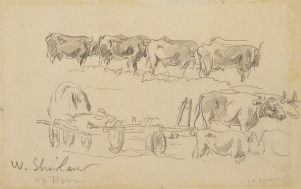 Theodor Philipsen created this small drawing, "Køer på en mark," using ink on paper. The quick, economical lines suggest Philipsen sketched this 'en plein air,' capturing a fleeting moment of cows grazing. The paper itself has a warm tone, providing a soft backdrop to the stark lines of the ink. Note how the artist uses the varying pressure of the pen to create a sense of depth and shadow. The cows in the foreground are rendered with bold, confident strokes, while those further away are suggested with lighter, more tentative marks. This work is a reminder that drawing is an act of both observation and reduction. It invites us to consider the labor involved, not just of the artist's hand, but also of the pastoral scene he depicts. The image prompts reflection on the social context of dairy farming. By focusing on the everyday, Philipsen elevates the mundane, and blurs the lines between high art and the humble realities of working life.