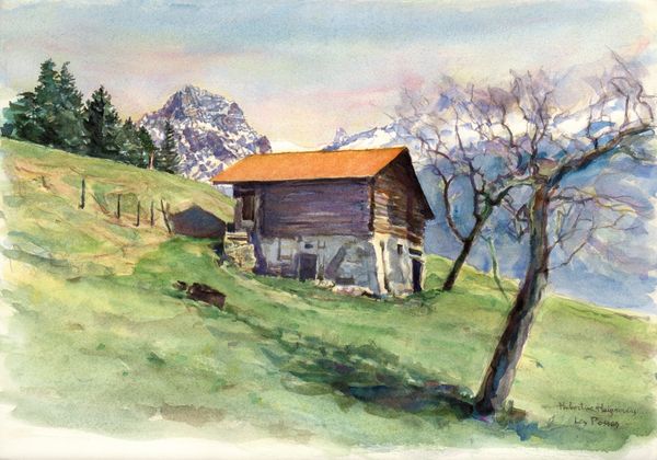 Editor: So, here we have Hubertine Heijermans' watercolor, "Posses-Dessous - a Swiss mountain barn," from 2003. I'm really drawn to how she's captured the textures of the stone and wood. It makes me wonder about the actual building of this structure. What do you see in this piece that perhaps I'm missing? Curator: It's interesting to consider this not just as a landscape, but an artifact of labor. The different materials, the rough stone foundation supporting the timber structure… it speaks to very specific processes. Someone quarried that stone, hauled it, and painstakingly assembled it. Then others would've felled and processed the wood. The artist even accentuates these processes through their handling of the watercolor medium. Editor: You're right, seeing the process of how these resources came together adds another dimension to the piece, It makes the whole scene feel more 'grounded', if that makes sense. The actual labor involved isn't always visible when viewing art of this kind. How does the function of the barn influence your materialist interpretation? Curator: Well, a mountain barn wasn't just shelter; it represented agricultural output, storage of value. That barn *is* wealth, or at least a key part of its generation. The materiality therefore reflects ownership and the control of resources within this landscape, which Heijermans subtly underscores through her dedication to realistic depiction. What does realism even *mean* if it doesn't consider these processes? Editor: I see, it makes sense to look beyond the surface to understand labor as an historical or even social component of the artwork. This approach to reading art focuses so much more on the background and cultural roots of making. Thanks for your insight. Curator: Indeed! Looking at it this way helps us appreciate the multifaceted nature of art.