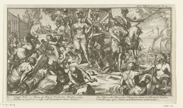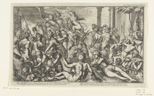 Curator: This engraving, dating sometime between 1580 and 1626, is entitled "Psyche wordt door Mercurius naar Olympus gebracht," or, "Psyche Brought to Olympus by Mercury," created by Bartholomeus Willemsz. Dolendo. Editor: Wow, it's… busy! A swirling cloud of classical figures. A bit chaotic, even, but undeniably arresting. All those nudes definitely command your attention. Curator: Indeed! Mannerism thrived on such dramatic compositions. Consider Mercury, the messenger god, escorting Psyche to Olympus. We see the culmination of Psyche's journey: her acceptance amongst the gods, immortality achieved through love. But notice the city depicted far below; a symbol, perhaps, of the mortal realm she leaves behind. Editor: It strikes me as a mash-up, doesn’t it? Like the artist threw every mythological character into a blender, hit "high," and this is what poured out. And the engraving, with its dense lines, adds to that swirling sense of constant movement, an emotional turbulence too, like the turmoil of love. Curator: You've picked up on key features of Mannerist prints. There's a deliberate tension, an artificiality that sets it apart from Renaissance ideals of balance. Note the psychological tension achieved by elongated bodies and contorted poses: emblems of heightened emotion. The ascent, visualized through elevation, points to spiritual aspiration and divine favor. Editor: But, isn't it ironic? The figures almost seem… detached. They're floating on their clouds of self-importance, elevated physically but not emotionally. I almost feel bad for Psyche. Like, "Welcome to eternity. Hope you like aloof people and permanent judgment." Curator: Such complexity of emotions speaks volumes for its enduring power. These symbols, pulled from classical mythology, tapped into universal experiences and longings. It's a reminder of how old stories shape new meanings in a changing world. Editor: Maybe that's the real trick of Mannerism, though. It's like a coded language. You *think* you're seeing beautiful gods and goddesses, but actually, it’s about all the complicated messy bits inside our own heads. Anyway, I appreciate getting to know a piece that definitely offers a full mind-trip.