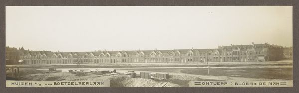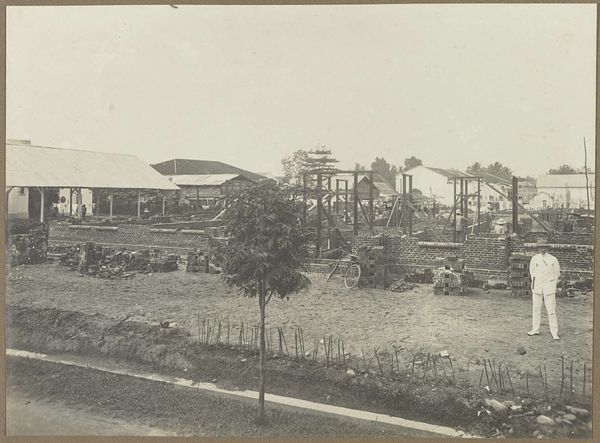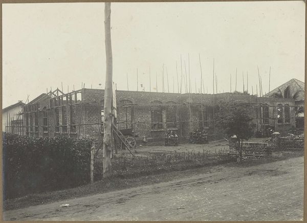 Editor: Here we have a black and white photograph, titled "Villa in aanbouw," which translates to "Villa under construction," dating from 1914 to 1919. The artist is anonymous, and the medium appears to be photography. It feels documentary, capturing a specific moment in time. What can you tell me about this piece? Curator: This photograph presents a fascinating snapshot of a society undergoing transformation. Note the "villa" itself, seemingly grand in its design, juxtaposed with the rudimentary construction site. What do you notice about the landscape surrounding it? Editor: It looks muddy and quite barren, almost industrial despite being a construction site for a house. Curator: Exactly. Consider the years it was taken, 1914-1919. Europe was engulfed in World War One. The picture likely represents a tension: the promise of progress and luxury signified by the villa versus the stark realities of war and its aftermath. This could represent those elites detached from society. The photograph also reminds us that even seemingly neutral images can be deeply political, reflecting societal inequalities and power dynamics. Who benefits from this construction? Editor: So the construction itself, captured in this way, almost becomes a symbol of larger social forces at play? Curator: Precisely. It speaks to the aspirations and inequalities prevalent in the society of the time, making it more than just a building under construction. Editor: This has really made me think differently about how seemingly simple images can carry complex social commentary. Curator: And for me, it highlights the enduring power of art to document and critique, offering valuable insights into historical moments.