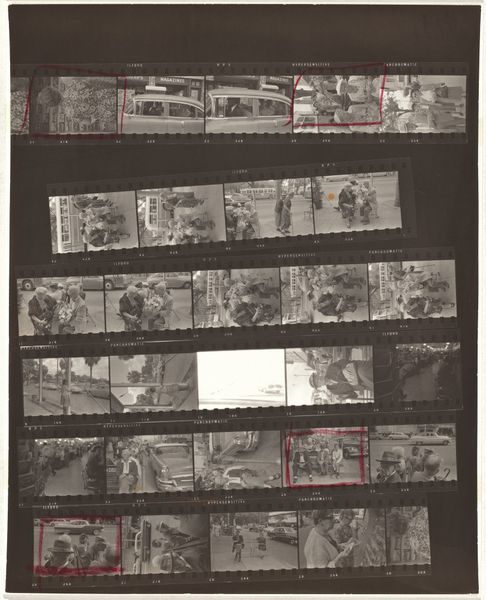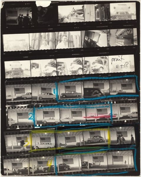 Robert Frank made this photographic work, Parade--New York City D, using gelatin silver on paper. Rather than presenting a perfectly resolved image, Frank foregrounds the means of production. Here, the artist is not just presenting us with a photograph, but the film strip itself – a sequence of images, some marked with grease pencil to indicate his preferred shots. The very materiality of the film is laid bare, reminding us of the labor and decision-making involved in crafting a seemingly spontaneous image. Frank’s approach isn’t about hiding the process, but revealing it, allowing us to see the layers of selection and the inherent imperfections of the medium. By showing the film strips, Frank is highlighting the photographic process and hinting at the narrative that emerges from the arrangement of images. Frank challenges traditional notions of photographic perfection, instead emphasizing the importance of the photographic process.
