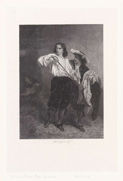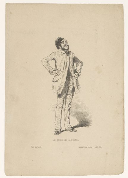 Curator: What a striking image! We're looking at "Singing Opera Singer with Dagger," a lithograph by Paul Gavarni, created in 1844. It's currently housed here at the Rijksmuseum. Editor: My immediate impression is one of exaggerated theatricality. The sharp, angular lines used to depict the singer create a caricature-like quality. There is an intense feeling with the figure seemingly bursting forth with emotion and gesture. Curator: Gavarni was well-known for his social caricatures in Parisian journals. This lithograph captures a specific moment within the world of Romantic opera, likely poking fun at the dramatic intensity, perhaps even excesses of the performances, especially at the melodramatic scene. Editor: Yes, you can really feel the emphasis on line, on movement. Notice how the shading around the singer’s mouth and brow enhances the drama. The lithographic technique is expertly used to create a range of textures, from the soft rendering of his face to the crisper details of the costume. The use of this technique accentuates light and shadow throughout this artwork. Curator: And what’s interesting is how Gavarni highlights the artificiality of the spectacle. The singer, adorned in an elaborate costume with that feather in his cap and thrusting that little dagger, becomes almost a symbol for the constructed emotions of operatic performance. Editor: There is some subtle mockery embedded here. The figure feels grotesque due to the contorted expression on his face and overly elaborate costume with decorative patterns. The composition directs our eye in many different places making the focal point, or figure, disorienting and confusing. Curator: I agree. Gavarni’s work serves as a great reminder that even within the high arts, there was always a space for critique and satire. The popular press offered an avenue to debate social roles, theatrical conventions, and artistic expression itself. Editor: Absolutely. It shows how closely visual analysis, noting line and composition, helps reveal embedded meanings while taking into account a socio-historical perspective. Both approaches enrich our understanding. Curator: Precisely. Artworks like this become key touchstones for broader cultural discussions and transformations within that period.