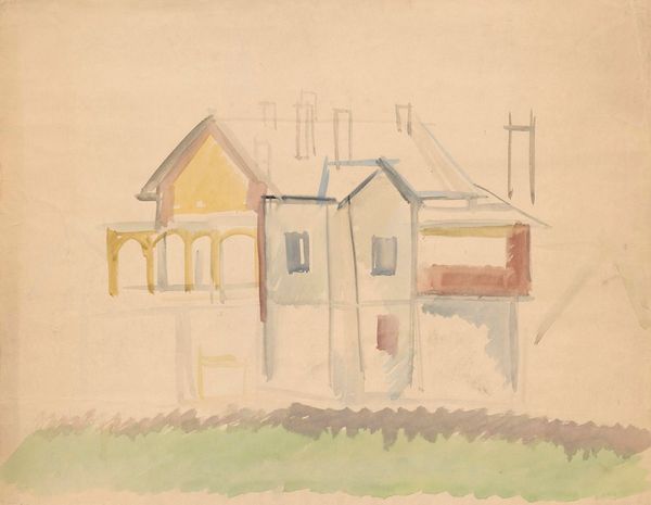 Curator: Lovis Corinth, born in 1858, painted this watercolor, "Burned-out Building in Holstein" sometime during his career. The artwork resides at the Harvard Art Museums. Editor: The ruin itself is a somber subject, and the artist's loose brushstrokes only amplify that feeling of desolation. Curator: The process of watercolor application is important here. Look how Corinth allows the white of the paper to show through, creating a sense of light and airiness, despite the devastation. The material choices speak to immediacy. Editor: But the composition directs our eyes in such a way that the negative space is a critical element. The building appears to be in a state of entropy, teetering. Curator: We can consider the impact of urbanization and industrialization on rural communities in Germany at the time. The remnants of labor and the means of shelter are laid bare. Editor: True, but the raw emotion is also conveyed through Corinth's distortion of form and the stark contrast between light and shadow. It is the tension itself that conveys the underlying feeling of despair. Curator: Ultimately, the work serves as a reminder of the fragility of human endeavors, told through the life cycle of the building materials. Editor: Yes, and the universality of loss and decay, visually articulated through color, line, and form, is so powerful.