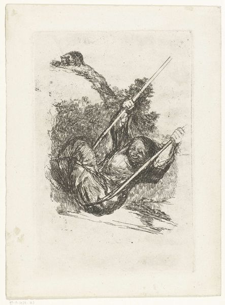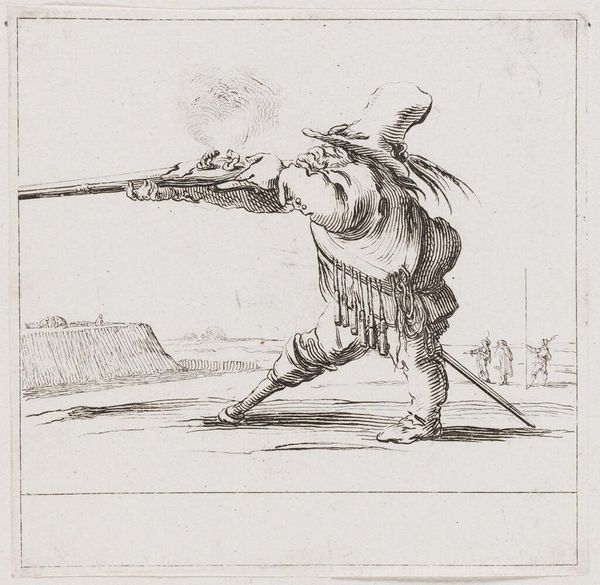 Editor: We are now looking at "Man met enorme hoed op zijn rug" (Man with enormous hat on his back) by Cornelis Saftleven, created sometime between 1632 and 1645. It's a drawing that has been turned into a print. What strikes me most is the odd combination of serious detail in the figure’s face and the ridiculousness of the large hat, topped with a duck’s head. What's your take? Curator: Indeed! The 'duck head hat' tells a specific story within its time, operating in the space between humor and social critique. These types of comical depictions of everyday people were popular and spoke volumes about societal hierarchies. Look at his attire. He seems like someone trying to project power with his sword and staff but ultimately failing, given the absurdly large hat and almost burdened posture. Editor: So you're suggesting it’s more than just a funny image? What would viewers at the time think about that? Curator: Absolutely. Genre paintings and caricatures were often used to gently mock certain behaviours, fashions, and, potentially, aspirations of social mobility. Saftleven gives us insight into Dutch society and how certain figures were perceived. What is considered funny says a lot about what is socially acceptable at that point in time, who holds power and why. The image could function almost like political satire. It asks "who gets to wear what, why do they think that's the way it should be?". The sword, a symbol of power and authority, looks almost unusable here. It could very well have been intended to subtly critique certain aspects of society at the time. What do you think? Editor: I hadn't considered that. I see it now. He appears weighted down not just by the hat but also by these social pressures. Curator: Precisely. And by depicting this, Saftleven participates in a dialogue that was already ongoing. Editor: It is really interesting how art can reflect and comment on social conventions. Curator: Exactly. And these works give us some incredible access into ways of seeing and ways of thinking that have since shifted, changed, or been overturned entirely.