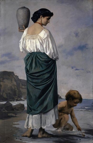 Curator: Anselm Feuerbach’s painting “On the Seashore” presents a solitary figure standing upon a craggy coast. The palette is restrained, dominated by earth tones and muted blues, heightening the sense of quiet contemplation. Editor: It's immediately striking, isn't it? The color scheme seems designed to evoke melancholy. There's something mournful, even elegiac, about her stance and the vast, empty seascape. Curator: Feuerbach, associated with German Romanticism, often explored themes of classical antiquity and personal loss. His work, generally figurative, displays idealised forms within an arrangement designed for the painting. Editor: Yes, there is clearly a Romantic's sensibility at work in the dramatic composition and the focus on individual feeling. This work may serve to exemplify the Romantic trope of humanity dwarfed by the natural world, by framing the woman against a boundless vista. To further emphasize that idea, notice her body language seems subdued, introspective even. Do you see a political context, perhaps commentary of the power structure, at the time? Curator: I'm compelled more by the formal elements than with any explicit politic commentary that the painting could be argued to suggest. Observe how the texture of the rocks contrasts against the smooth, flowing lines of her drapery. Feuerbach used layering and glazing techniques, notice the luminosity of the cloth, which also functions to visually juxtapose against the heavy, earthy forms, which draws the eye upward to the figure. This contrast animates the work and balances visual interests of texture with smooth color and line. Editor: Perhaps it's the cultural understanding that lends me to read more deeply to look at Romanticism as a rejection of Enlightenment values. But your points are well taken; and I note also the role of institutions, even individual commissions can dictate output, what do we read then of "On the Seashore"? Curator: Exactly, those systems of the art world have their hand indirectly informing these elements in his artwork. These constraints create this form and final state, a perfect intersection of all factors that yield a unique artwork with intrinsic characteristics, which are truly one-of-a-kind and thought provoking for me, on a base, formal level. Editor: Indeed. Seeing it in this way encourages consideration of the dynamic interactions between aesthetics and wider historical forces, allowing for artful meaning derived and revealed, through conversation such as these.