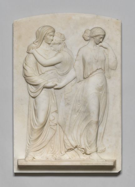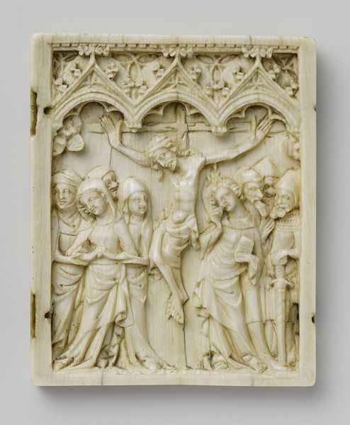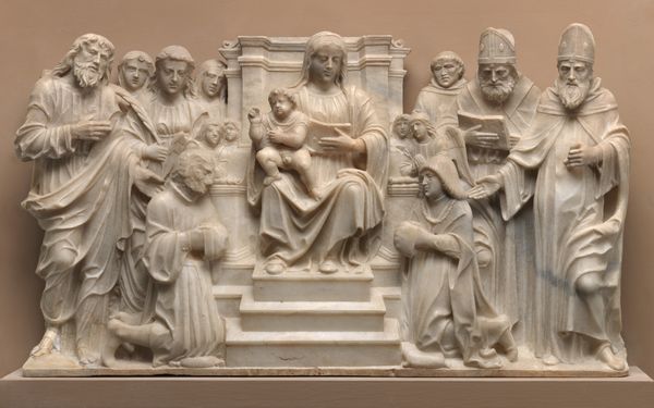This is a marble relief sculpture, 'Madonna and Child with Queen Sancia, Saints, and Angels' made by Tino di Camaino in the early 14th century. The immediate impression is one of serene symmetry. The composition is rigidly organized around the central axis of the Madonna and Child, framed by a symmetrical arrangement of saints and angels. Di Camaino's use of line is evident in the flowing drapery and the delicate carving of faces, while the texture of the marble adds depth and a tactile quality. This structured arrangement reflects a hierarchical worldview, typical of medieval art. The Madonna sits enthroned at the apex, signifying her spiritual authority. Queen Sancia kneeling humbly gestures towards the Madonna and Christ Child, reinforcing the divine sanction of earthly power. The structural clarity and symbolic order invites us to consider the interplay between religious belief, social hierarchy, and artistic representation in the late medieval period. The artwork offers a window into a world where faith and power were inextricably linked, and where art served as a potent means of visualizing these relationships.