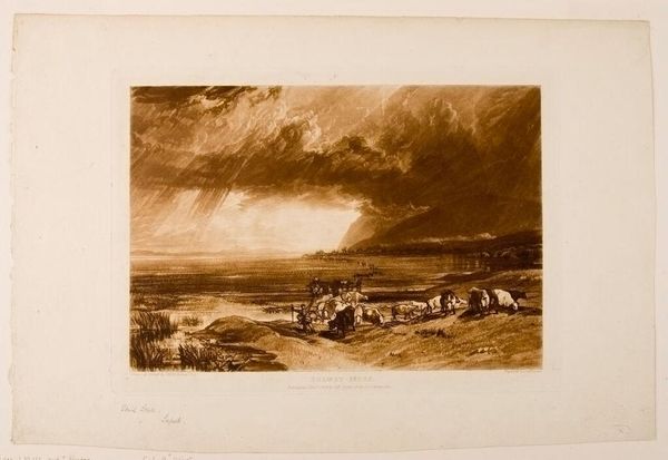 This etching, "Solway Moss", was created by Joseph Mallord William Turner as part of his "Liber Studiorum." Here, the looming storm cloud dominates, a motif stretching back to ancient depictions of divine wrath and judgment. We see it echoed in countless paintings, from tempestuous seascapes to dramatic biblical scenes, where darkness and light play out the eternal struggle between chaos and order. The humble cattle, dwarfed by the immensity of the landscape, remind us of humanity's precarious place within the natural order, a theme echoed in Romantic landscape painting across Europe. The fear and awe evoked by this cloud are primal, stirring a collective memory of vulnerability. Turner taps into this deep well of emotion, reminding us that nature, like the gods of old, holds immense power over our lives. It is this cyclical return of symbols, charged with emotion, that reveals the enduring power of images.