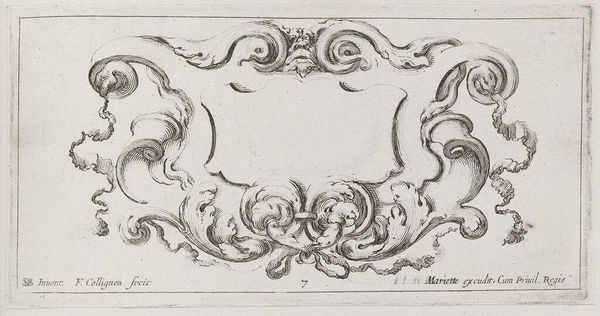 Curator: This delicate etching is titled "Cartouches," created by François Collignon. Editor: It feels so ornate, almost excessive. Like a frame waiting for a portrait of someone powerful, or perhaps a declaration of noble status. Curator: Indeed. Cartouches were integral to conveying status. They served as frames for inscriptions, often emblazoned on buildings or furniture to denote ownership and lineage. The cherubic figure at the top adds to this sense of importance. Editor: It also reads as aspirational, doesn't it? The blank space in the center allows for a reimagining of societal narratives. Who gets to occupy that space and what stories do they tell? Curator: That's a vital point. The void challenges us to consider whose stories are privileged and how we can advocate for more inclusive representation within these historical frameworks. Editor: It really prompts us to question the power dynamics inherent in art and its role in shaping our understanding of history and identity. Curator: Absolutely, and appreciating this piece helps us dissect those dynamics.
